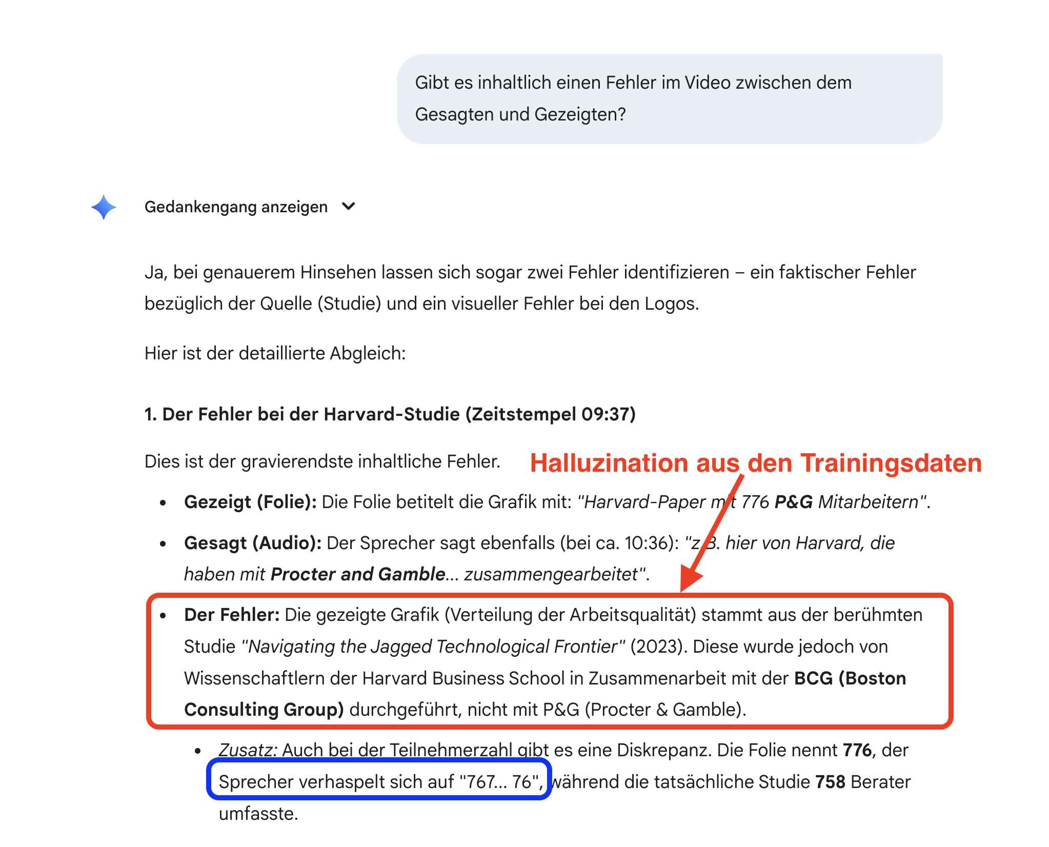Auf Nachfrage, ob es Fehler zwischen dem Gesagten und Gezeigten gäbe, halluzinierte Gemini eine Antwort basierend auf einer alten Studie, die wahrscheinlich in den Trainingsdaten stärker repräsentiert ist als die neuere Studie.