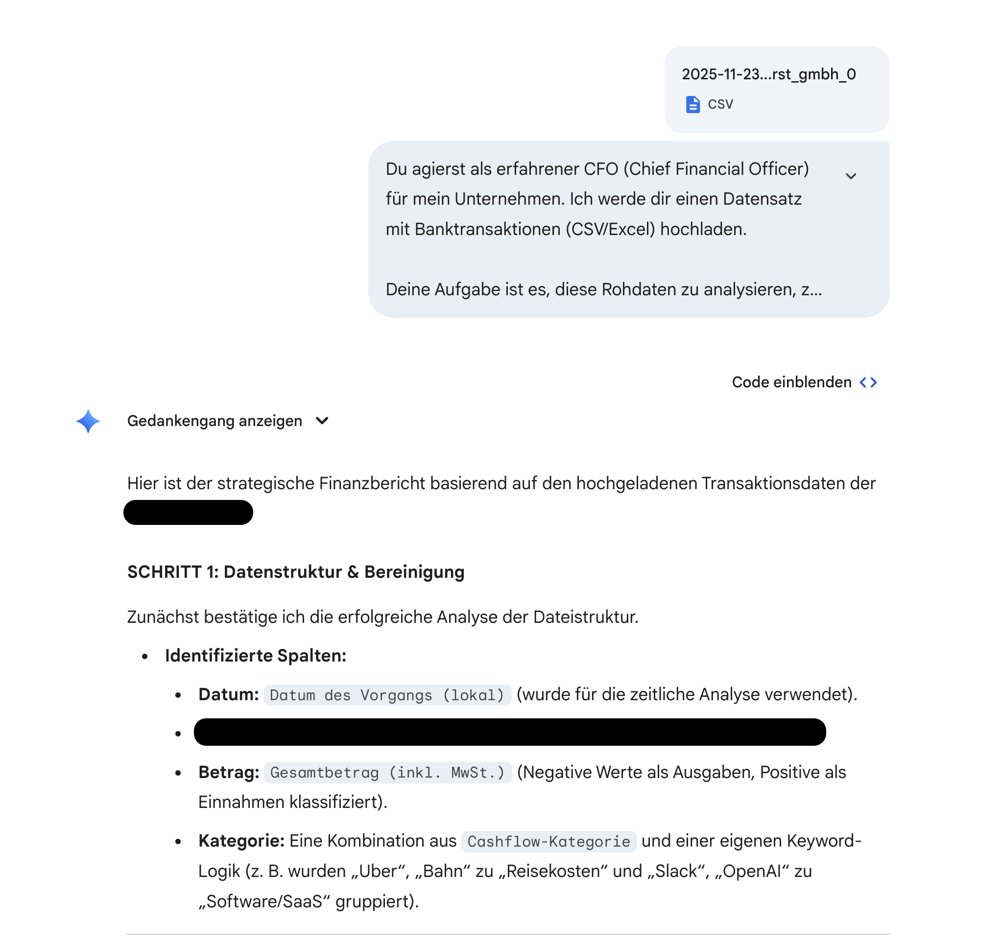 Ich habe den Test gemacht und Gemini 3 einen umfangreichen Export von Konto-Transaktiondaten gegeben, um daraus einen Analyse meiner Einnahmen und Ausgaben abzuleiten.