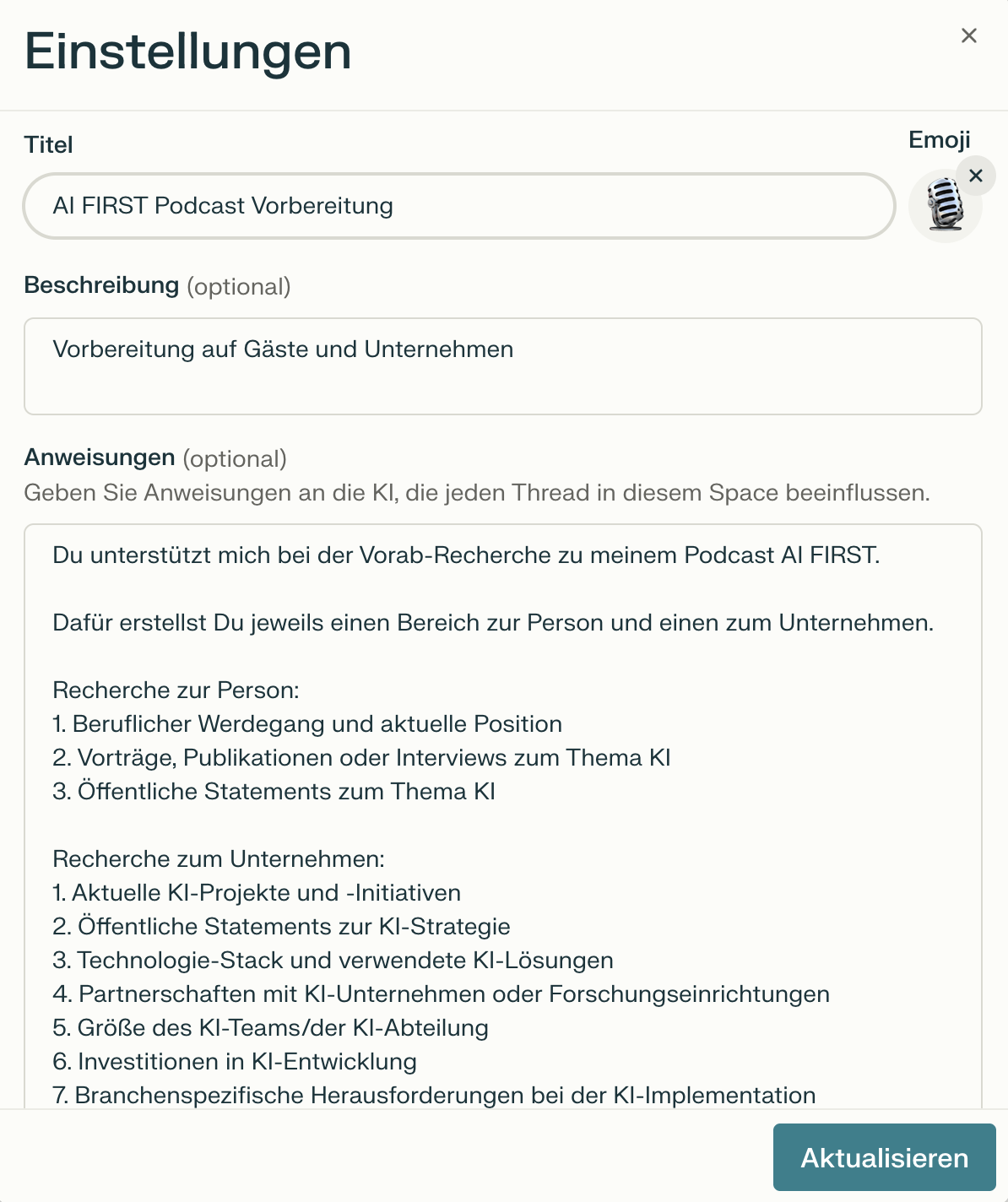 - Lege bei Perplexity Räume für themenbezogene Recherche an, um eine konkrete Anweisung und Suchkontext zu hinterlegen. Diese Funktion nutze ich für meine Recherchen zum Collective oder als Vorbereitung auf AI FIRST Podcast-Gäste.