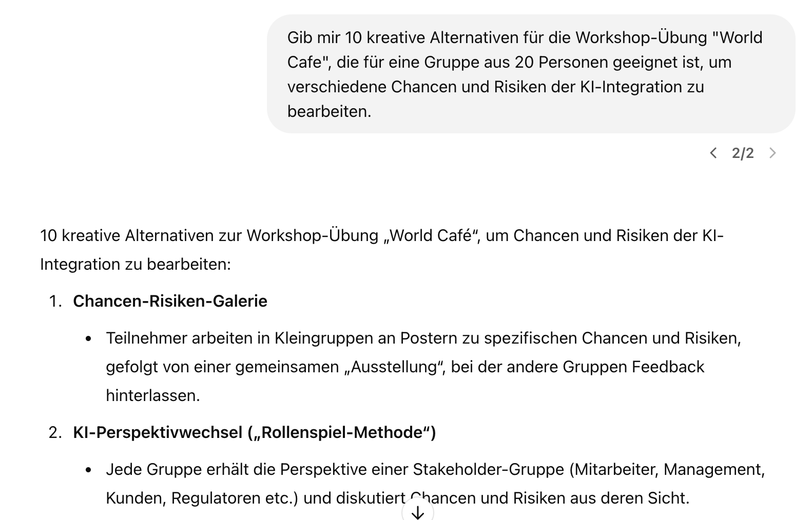 - Lass dir von der KI mehrere Optionen geben, denn der erste Vorschlag ist oft nicht der beste. Ich lasse mir meistens 5 - 10 Optionen, Alternativen oder Ansätze geben und arbeite den passendsten weiter aus.
