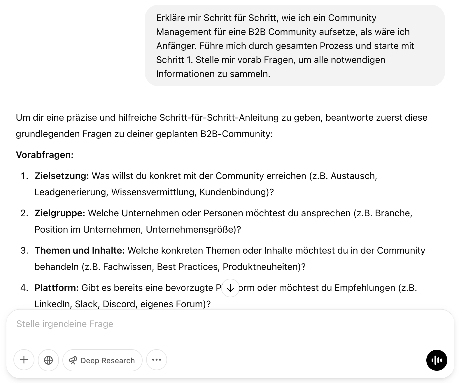 - Sagt deinem KI-Assistenten, dass er dir vorab Fragen stellen soll, um mehr Kontext zu deiner Situation und Zielen zu erhalten.