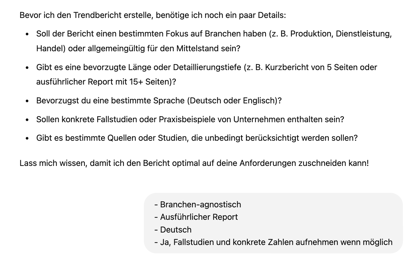 ChatGPT stellt zuerst Rückfragen, um die Recherche zu verfeinern: