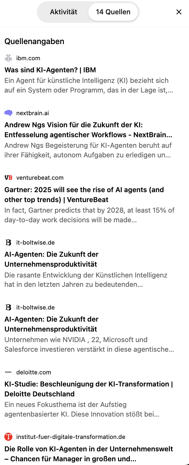 Auffällig war bei diesem Beispiel, dass Gemini die Google-Quellen stark bevorzugt hat. Das kann natürlich an der Aufgabenstellung liegen, aber deutet auch auf einen Bias im Modell hin.