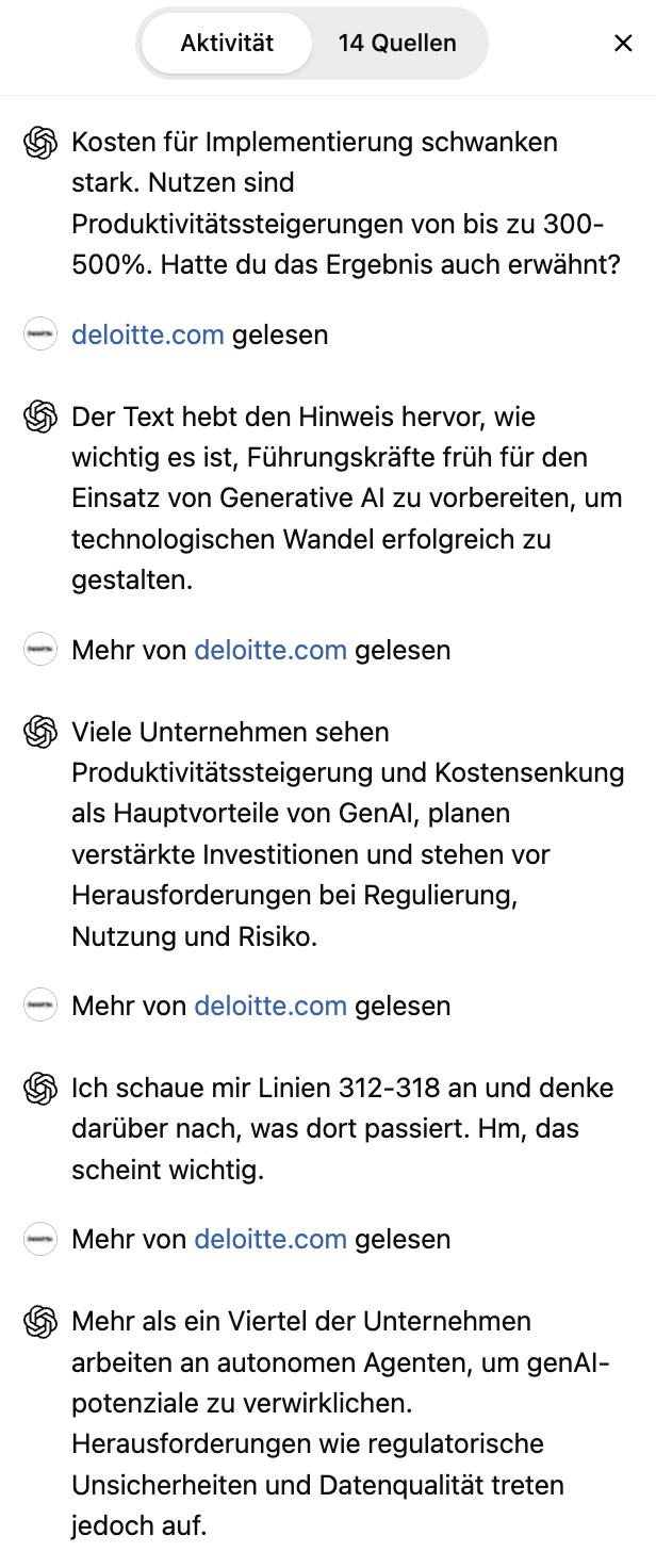 Nachdem ich die Fragen beantwortet habe, hat ChatGPT den Rechercheprozess gestartet. Die Recherche dauerte ungefähr 5 Minuten und umfasste 14 Quellen: