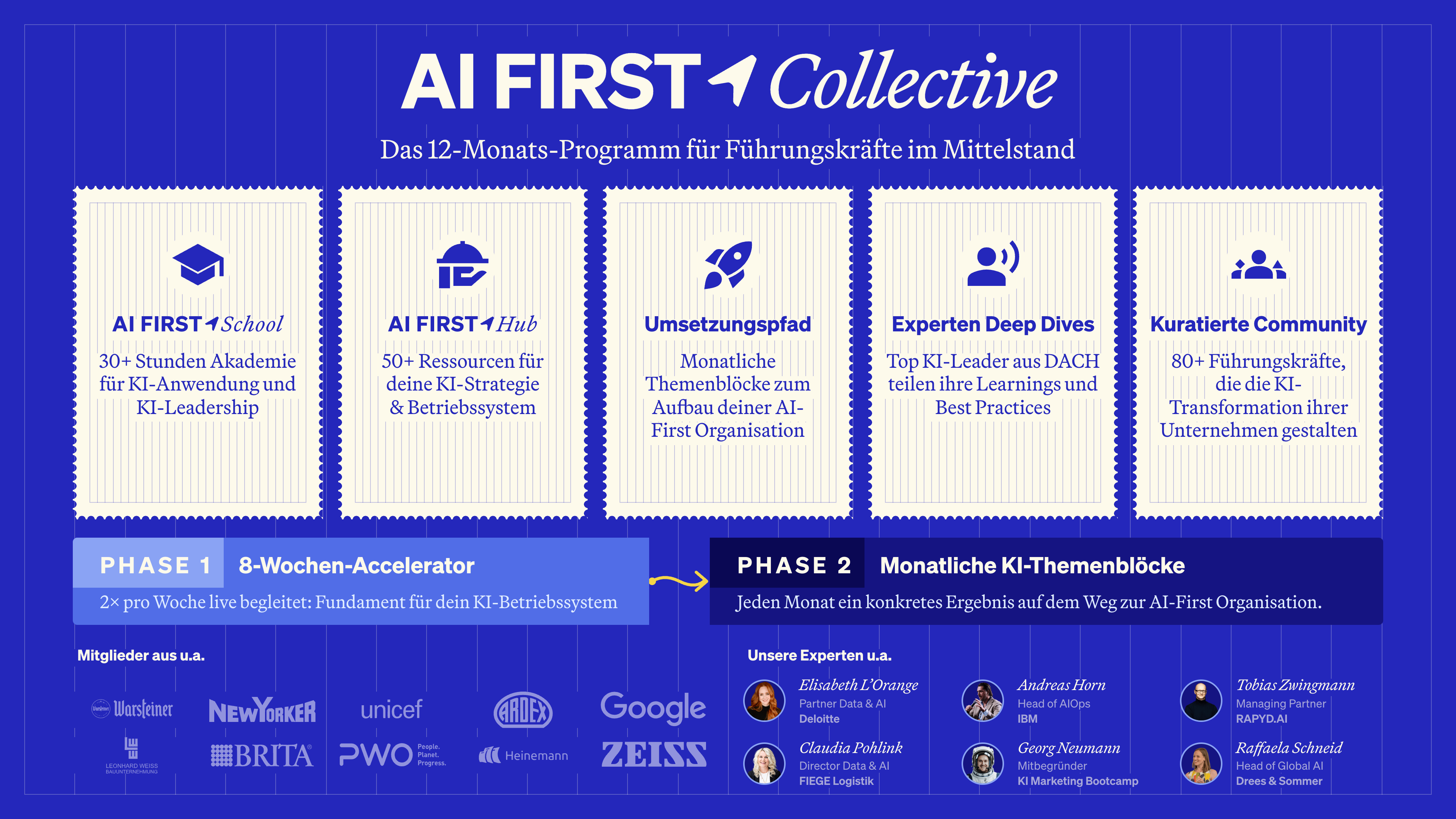 Zum 01. April nehmen wir neue Mitglieder in unser Collective auf. Dort triffst du auf 80 Führungskräfte, die die KI-Transformation in ihren Unternehmen verantworten. Im Collective bekommst Du Zugriff auf unser Wissen und unsere Werkzeuge zum Aufbau einer AI-First Organisation, die ihr Wachstum vom Headcount entkoppelt.