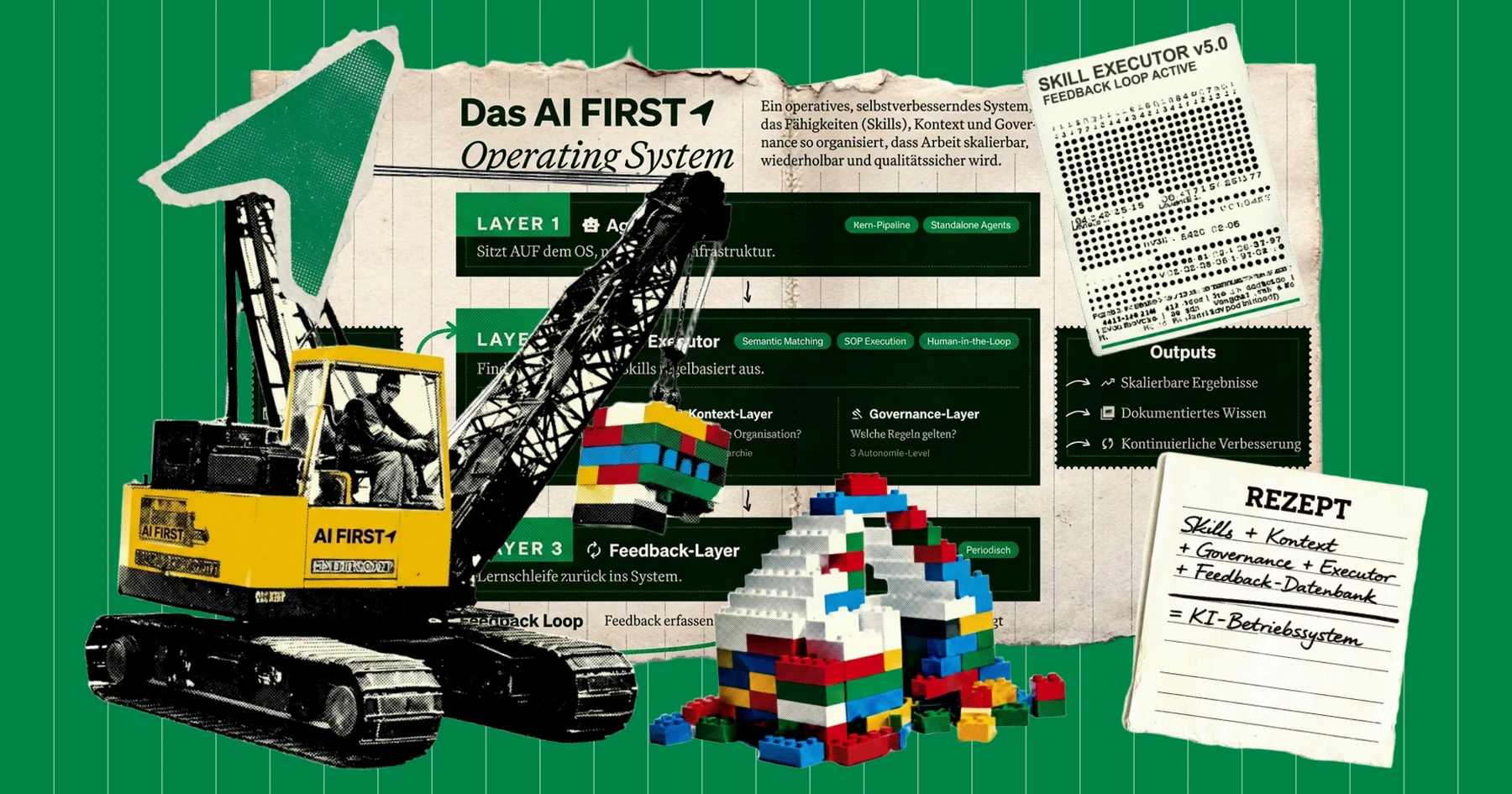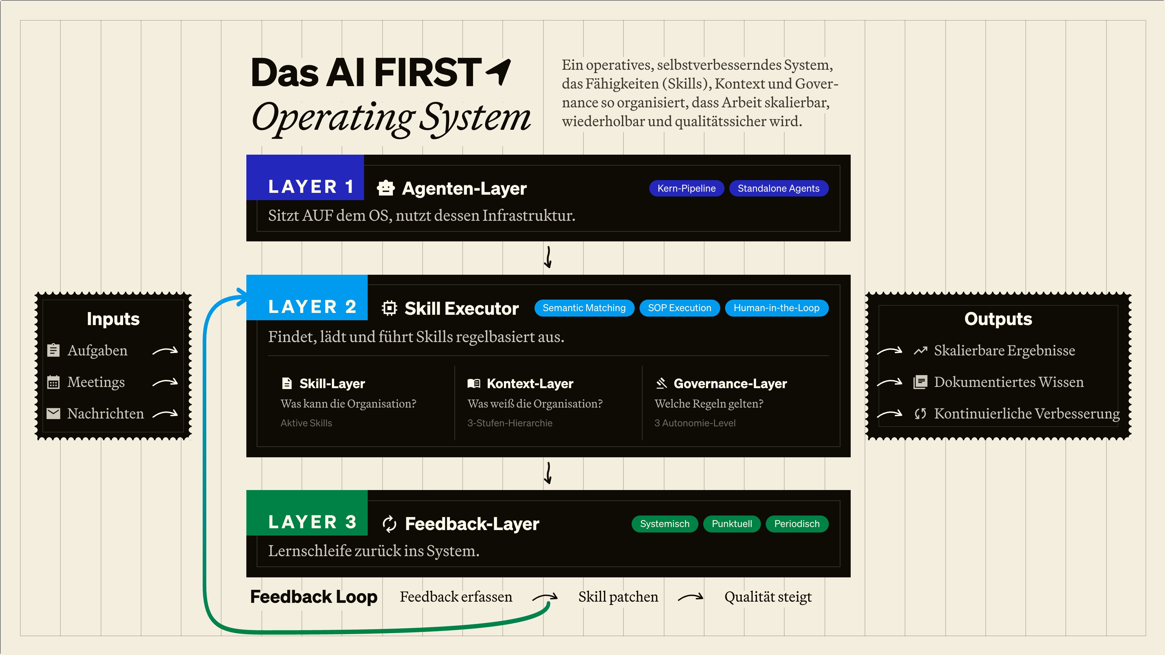 Und es gibt noch einen Layer, auf den ich heute bewusst nicht im Detail eingegangen bin: den Agentic Layer. Auf dem KI-Betriebssystem arbeitet bei uns mittlerweile eine Kette an Agenten, die einlaufende Arbeit automatisch erledigen – indem sie sich dynamisch aus genau diesen Bausteinen bedienen. Sie finden den richtigen Skill, laden den passenden Kontext, halten sich an die Governance und loggen ihr Feedback.