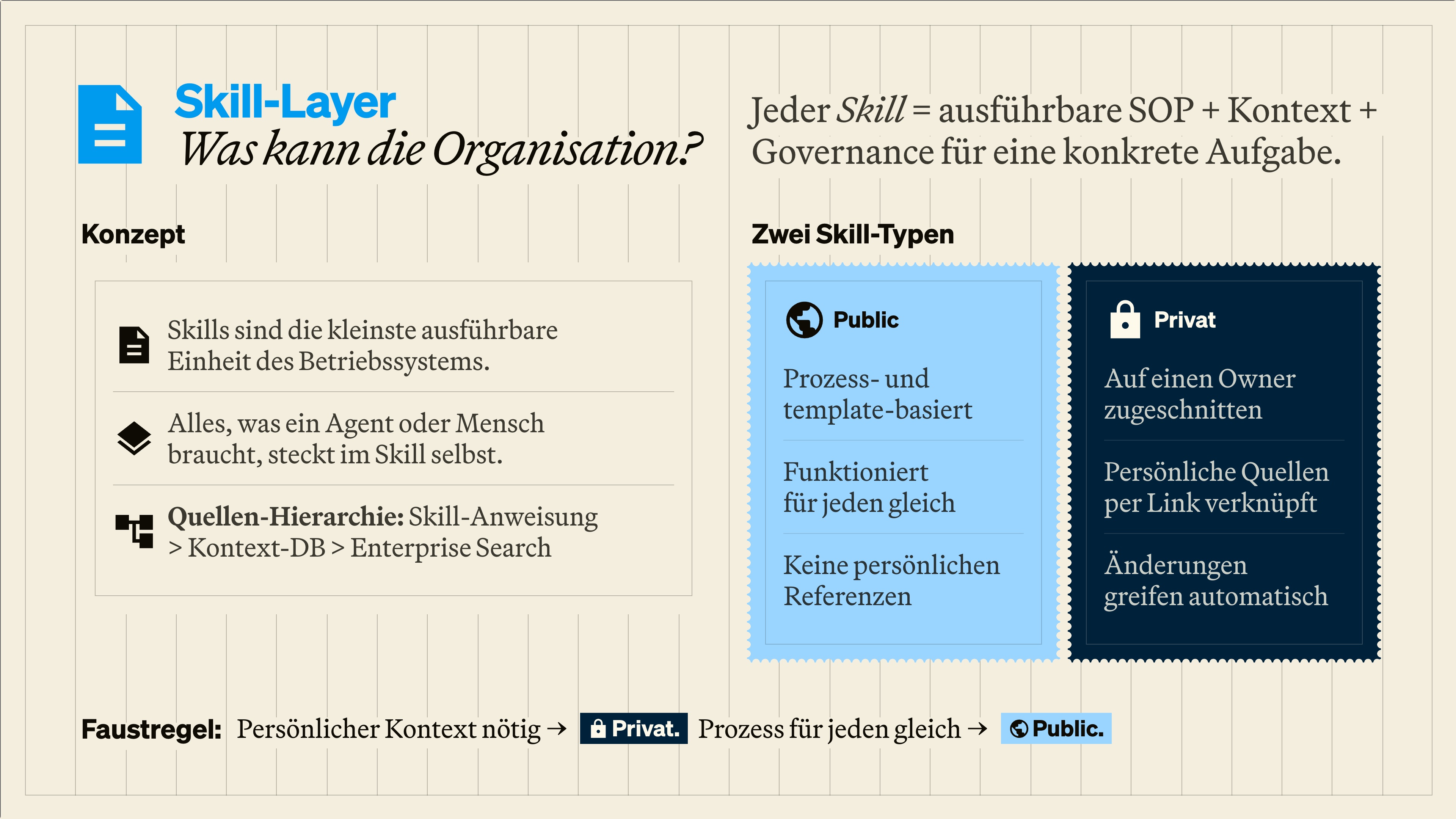 Ein Skill allein ist eine gute Arbeitsanweisung. Aber ein Skill, der seinen Kontext kennt, sich an Governance hält, von einem generischen Executor ausgeführt wird und über die Feedback-Datenbank lernt – das erzeugt am Ende den Hebel.