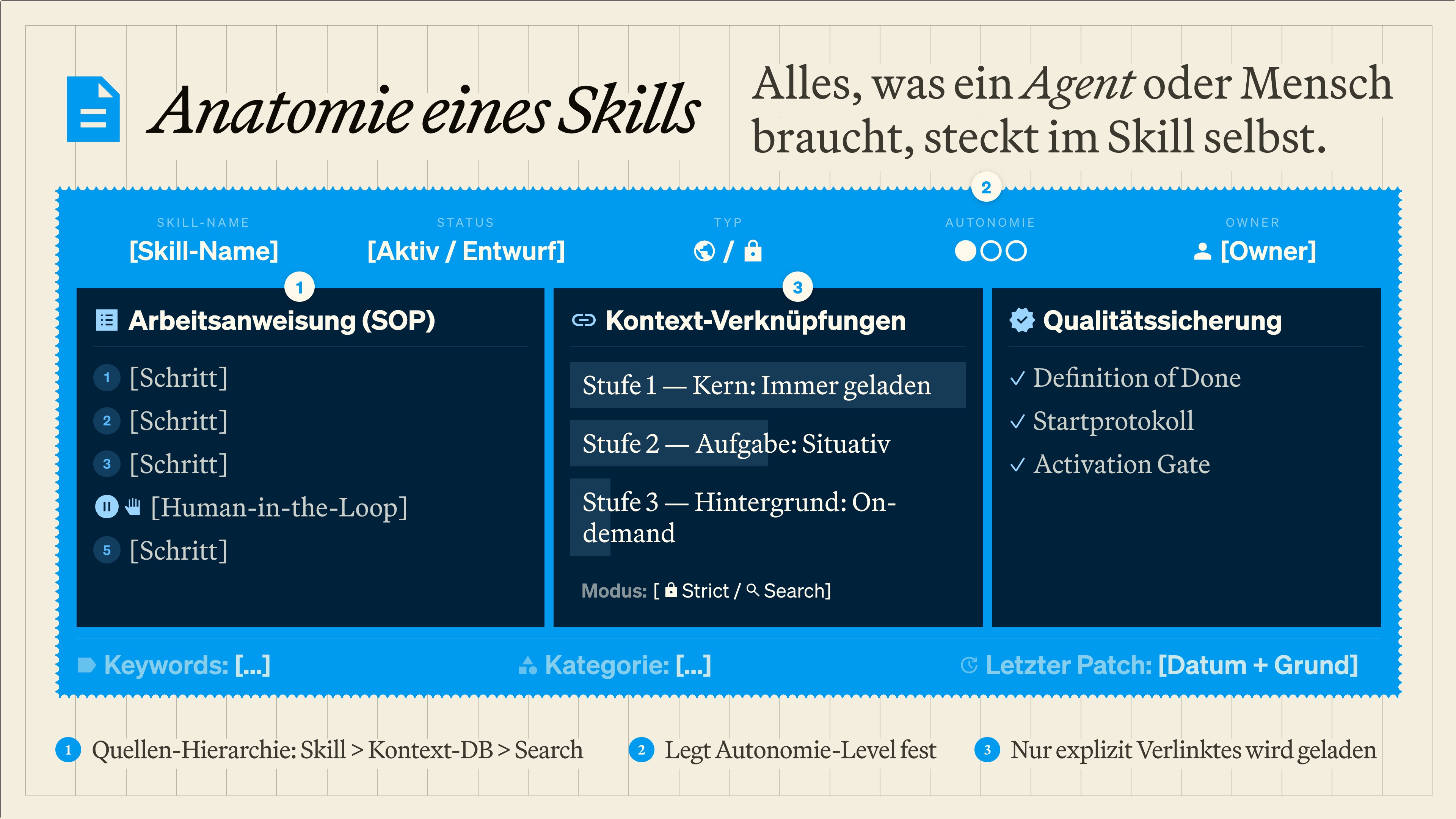Alles, was ein Agent oder Mensch braucht, um diese Aufgabe zu erledigen, steckt im Skill selbst: eine präzise Schritt-für-Schritt-Anweisung, eine Definition of Done, der Kontext, den er laden muss, und die Regeln, die dabei gelten.