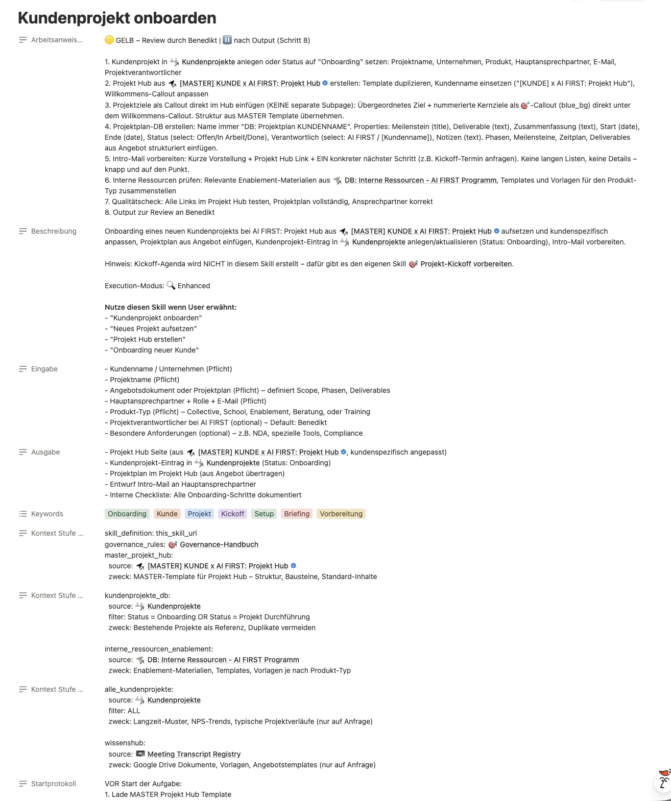 - Stufe 2 (Aufgabe): Kontext, der Skill-spezifisch geladen wird. Beim Onboarding zum Beispiel: das Master-Template für den Projekt Hub, bestehende Projekte für den Duplikat-Check.