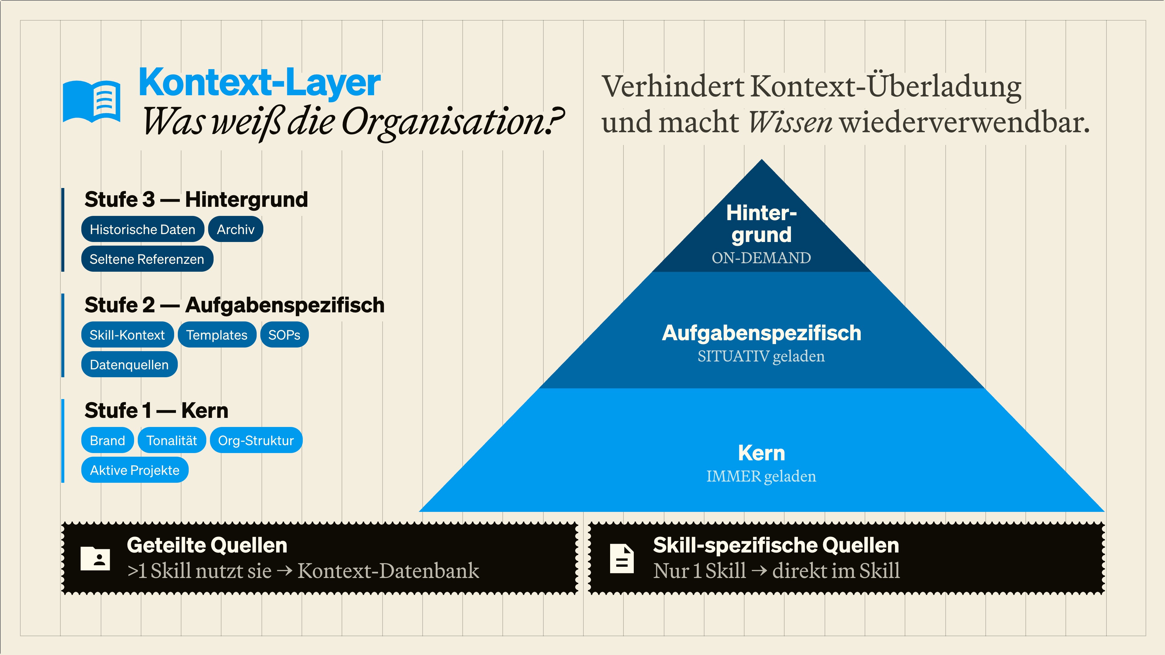 - Stufe 1 (Kern): Kontext, der immer geladen wird. AI FIRST Profil, Governance-Regeln, aktuelle Learnings aus der Feedback-Datenbank, die Skill-Definition selbst.
