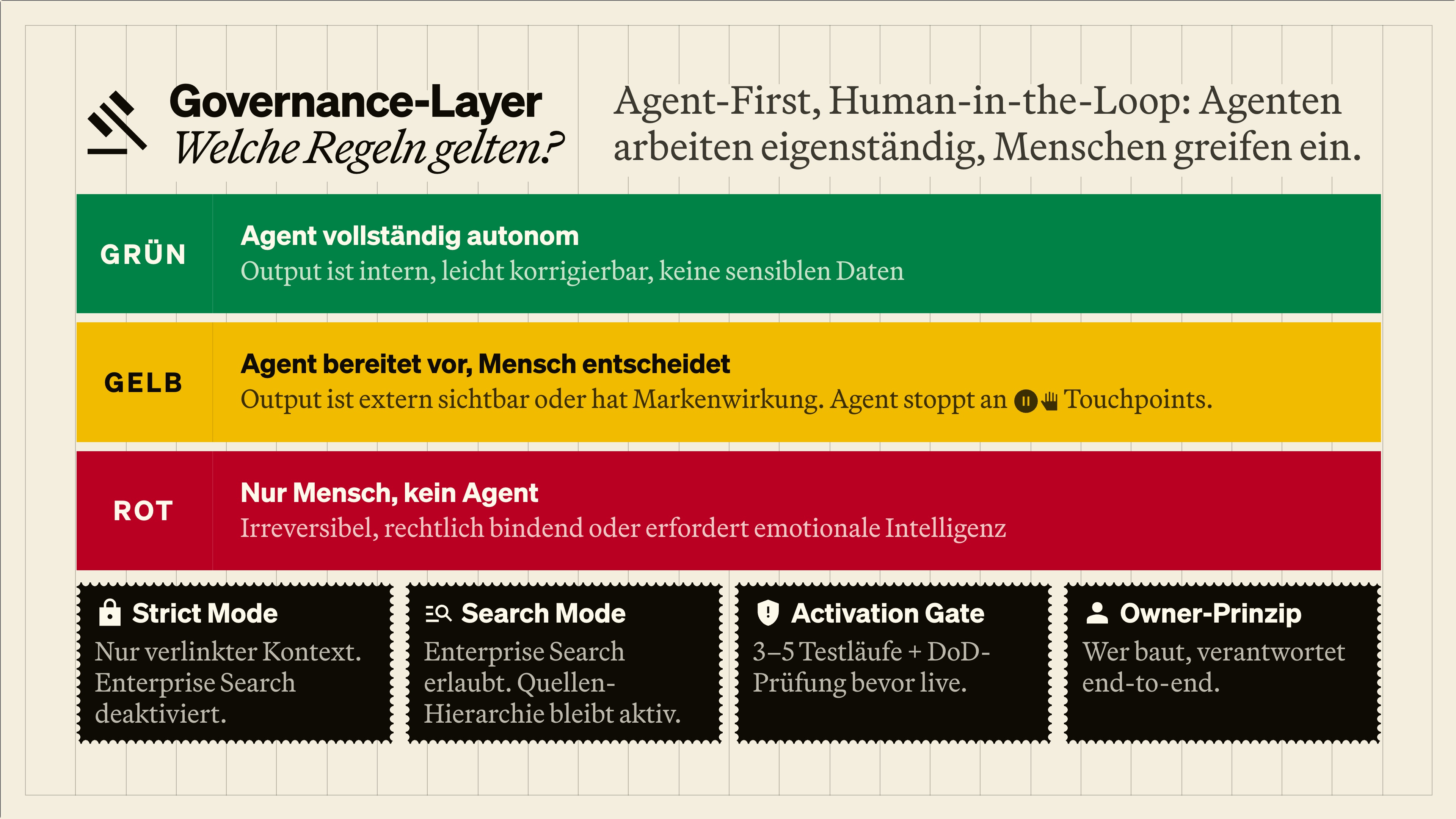 - 🟡 Gelb: KI bereitet vor, Mensch entscheidet. Alles, was nach außen geht oder Markenwirkung hat. Angebote, LinkedIn Posts.