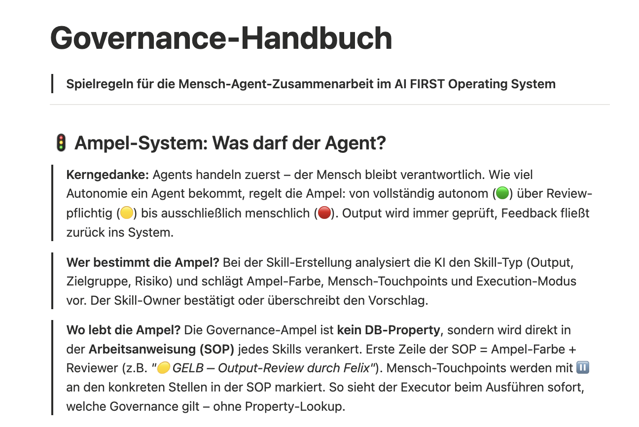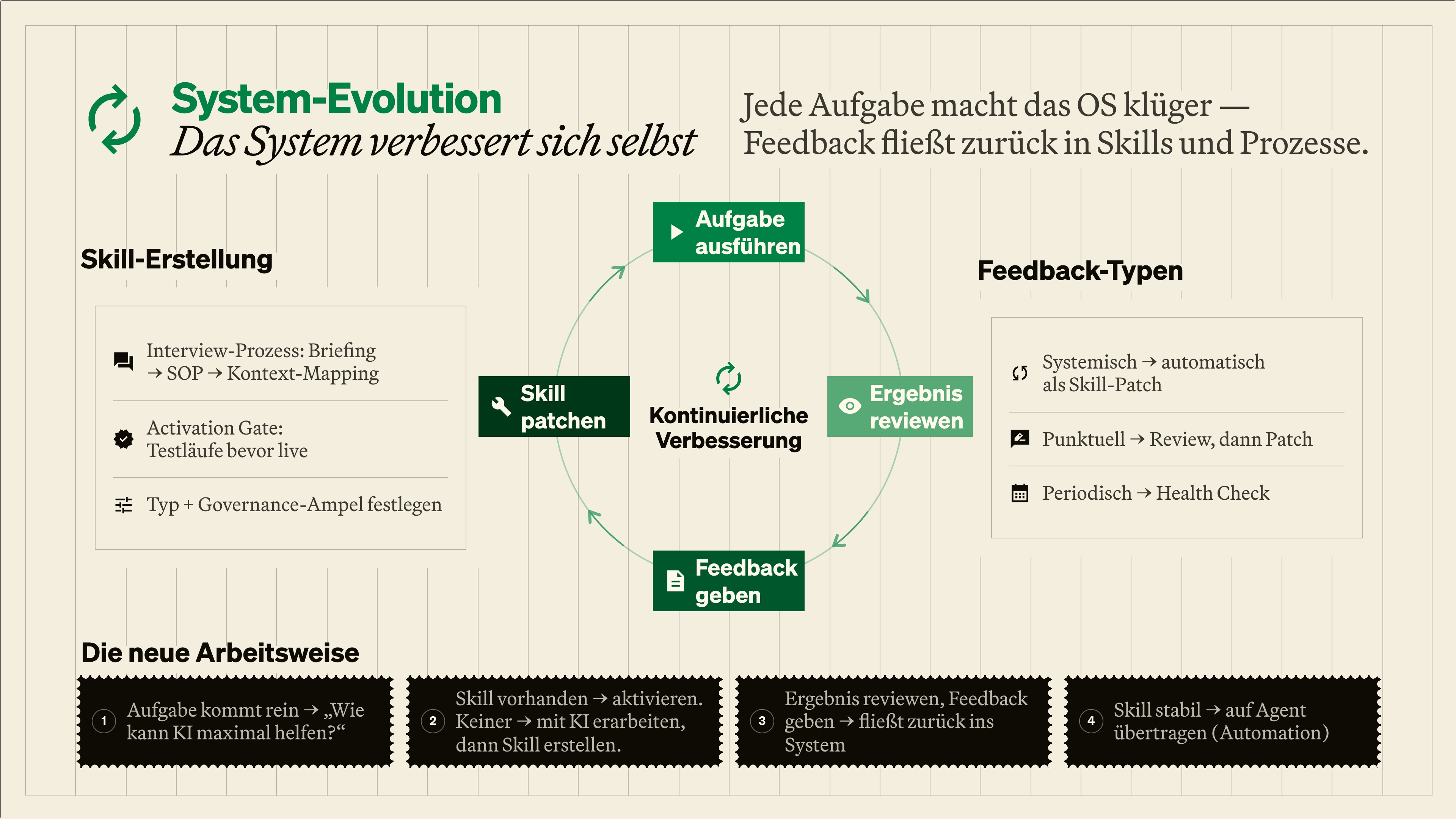 Wie das in der Praxis aussieht: Die KI führt unser Kundenprojekt-Onboarding durch. Der Kunde hat eine besondere Anforderung: Ein NDA muss vor dem Projekt-Hub-Sharing unterzeichnet werden. Das war im Standardprozess nicht vorgesehen. Die KI erledigt das Onboarding, loggt aber automatisch: „Compliance-Anforderung NDA war nicht im Skill dokumentiert. Vorschlag: Prüfschritt für besondere Compliance-Anforderungen ergänzen."