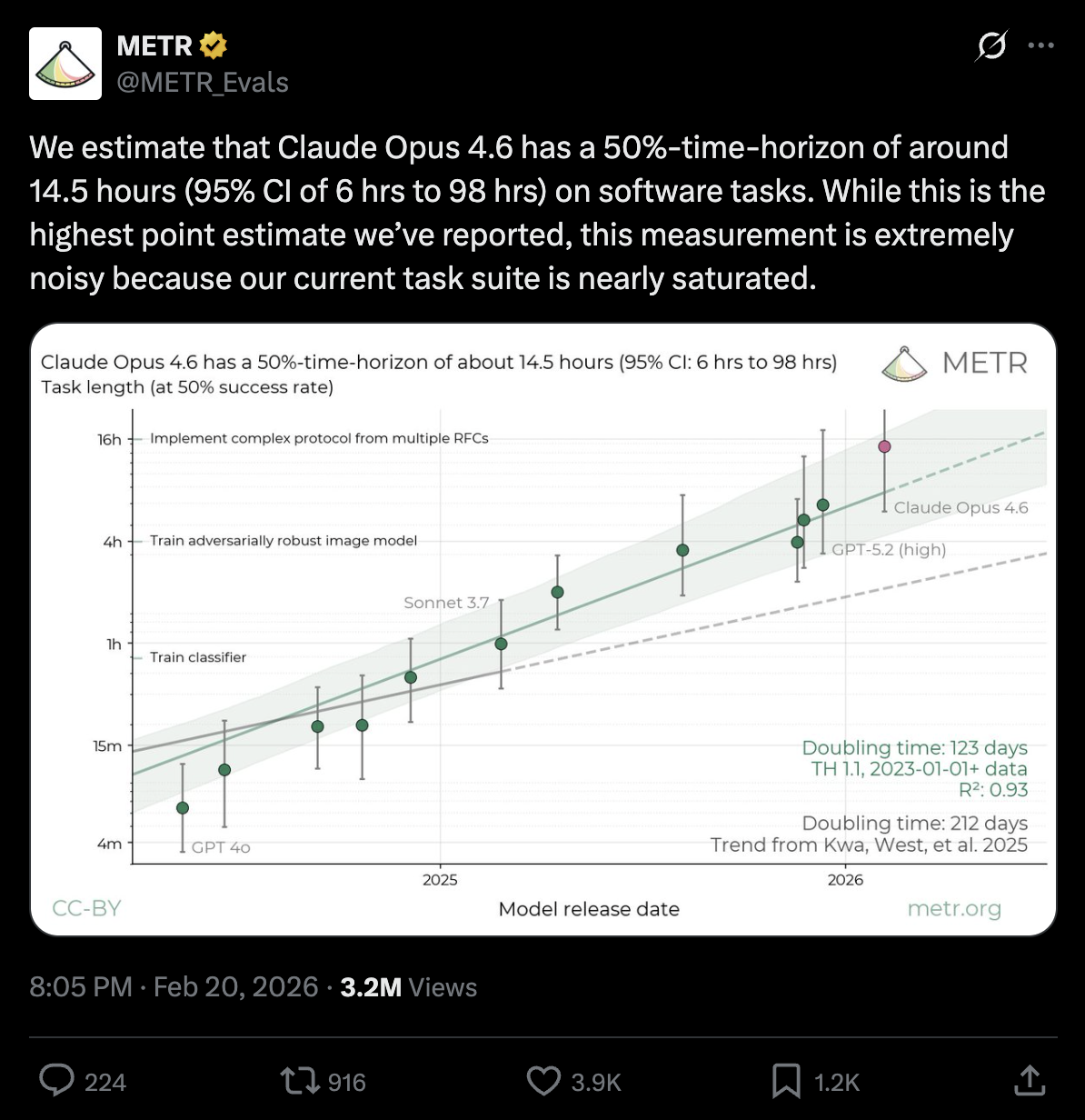 In der letzten METR Benchmark, die ich in den letzten Jahren wiederholt aufgegriffen habe, hat Opus 4.6 alle Testaufgaben gesprengt und konnte 14.5 Stunden an Coding-Aufgaben arbeiten. Vor 12 Monaten waren die Modelle bei ca. 1 Stunde. Wenn wir in ein paar Jahren auf diesen Chart gucken, werden wir ganz am Anfang einer exponentiellen Kurve sein.