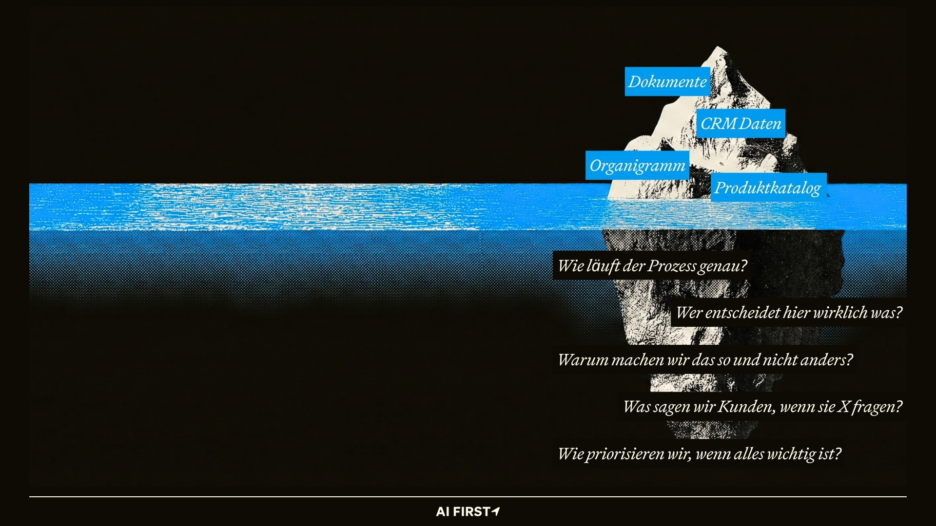 In jedem Unternehmen gibt es einen riesigen Berg an Wissen, der nirgendwo aufgeschrieben ist. Die Spitze über Wasser - das ist das, was explizit festgehalten ist. Dokumente, CRM-Daten, Organigramm, Produktkatalog. Den kann KI heute schon nutzen.