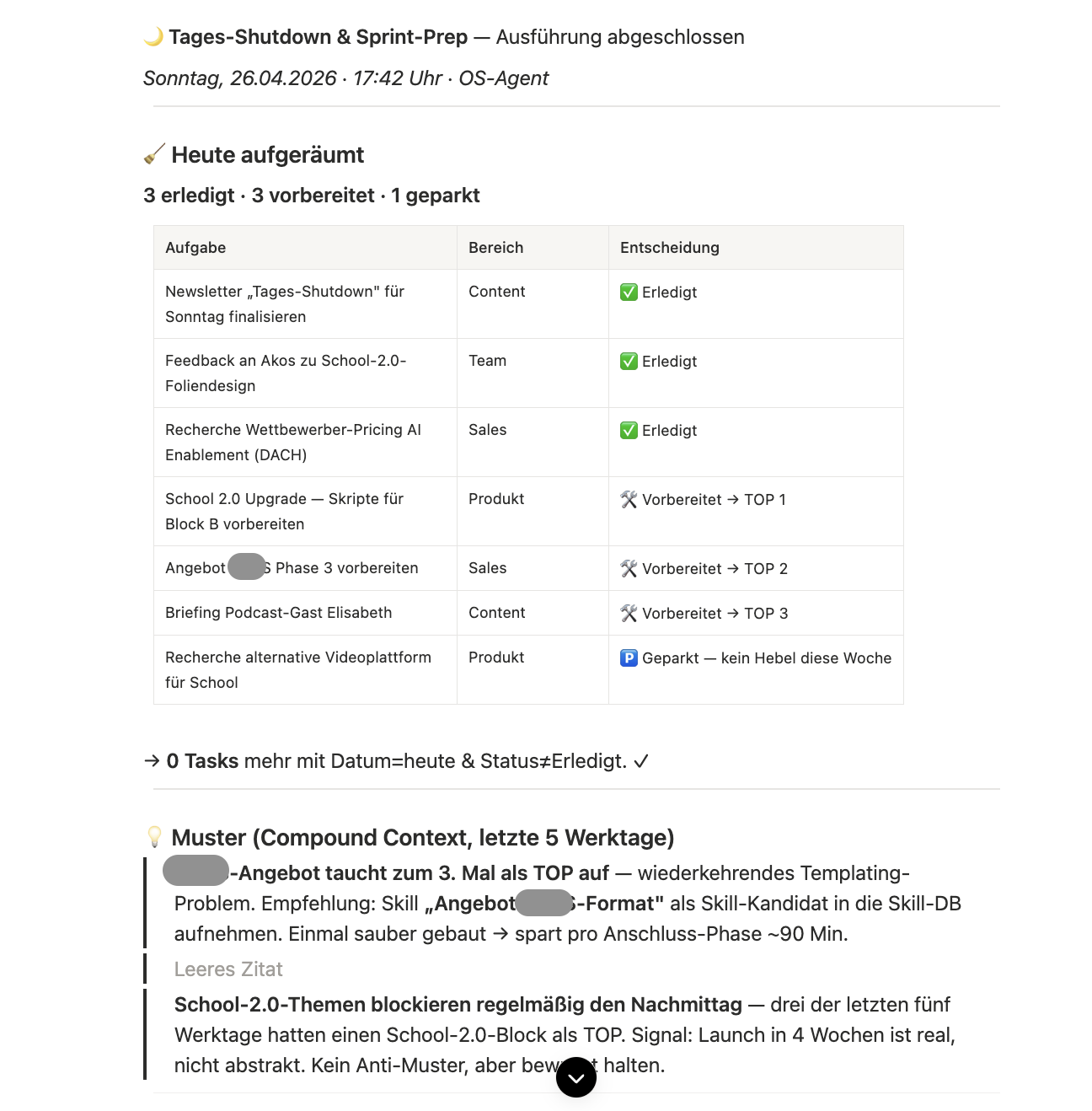 Mit dem Tages-Shutdown-Skill unterstützt mich unser OS-Agent beim Schließen aller offenen Tabs und der Vorbereitung des nächsten Tages. Jeden Abend schreibe ich “Tages-Shutdown” und in 15–20 Minuten gehen wir gemeinsam durch drei Funktionen, die mir viele Kopfschmerzen ersparen.