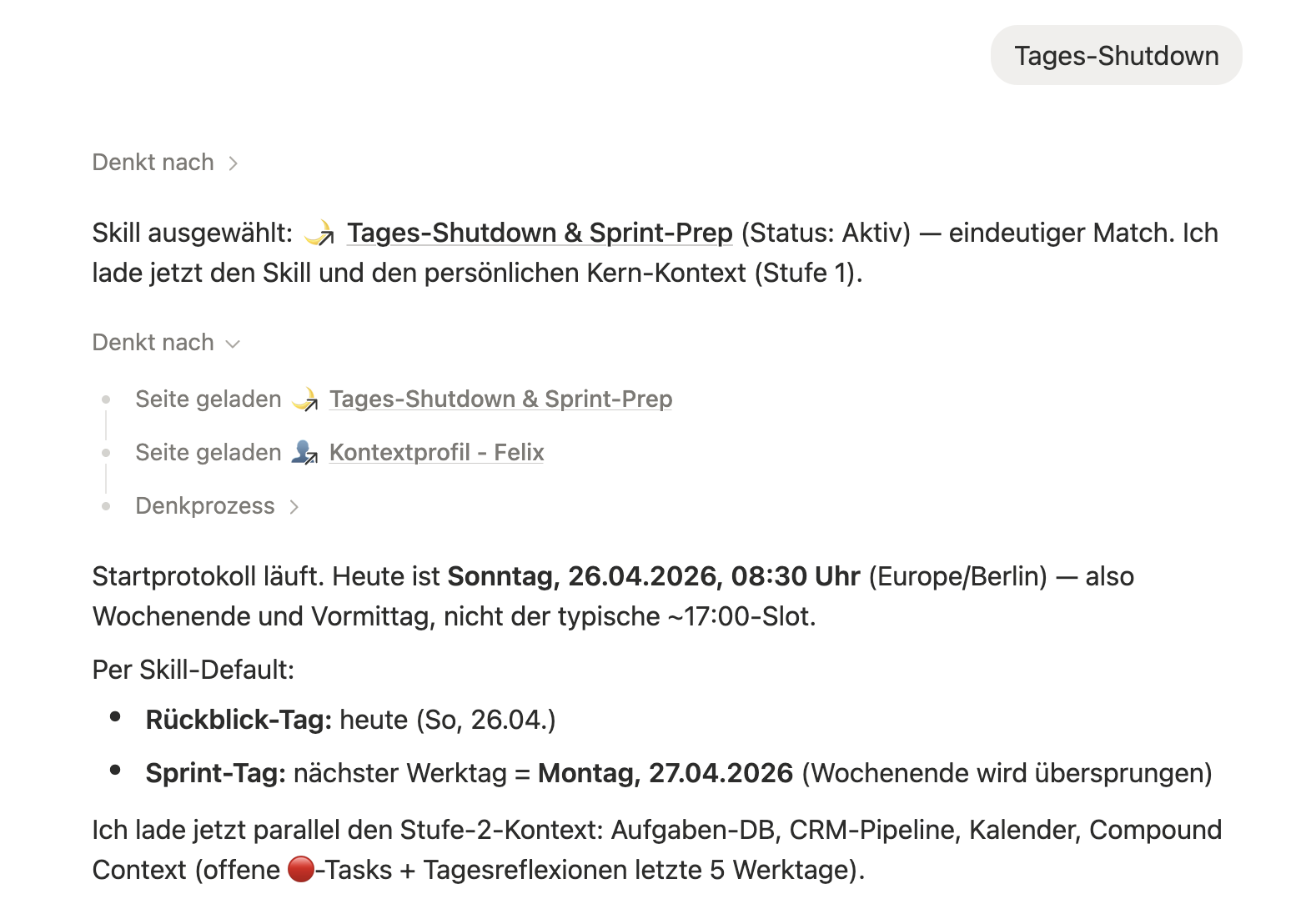 Mit dem Tages-Shutdown-Skill unterstützt mich unser OS-Agent beim Schließen aller offenen Tabs und der Vorbereitung des nächsten Tages. Jeden Abend schreibe ich “Tages-Shutdown” und in 15–20 Minuten gehen wir gemeinsam durch drei Funktionen, die mir viele Kopfschmerzen ersparen.