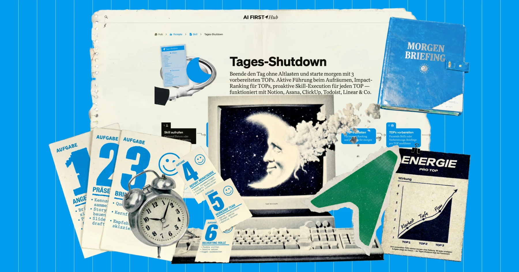 Im AI-First-Prinzip versuchen wir, KI für möglichst viele Routinen wertstiftend einzusetzen. Nicht nur, um einzelne Aufgaben effizienter zu erledigen, sondern auch, um Verhaltensmuster zu fördern, die uns den Tag und den Kopf strukturieren. Der Tages-Shutdown ist genau so eine Routine: Am Ende des Tages stehen alle offenen Punkte sortiert, die Prioritäten für morgen sind gesetzt und im besten Fall schon vorbereitet. So kann ich mit der verfügbaren Zeit mehr erreichen und trage gleichzeitig weniger mentale Last mit mir herum.