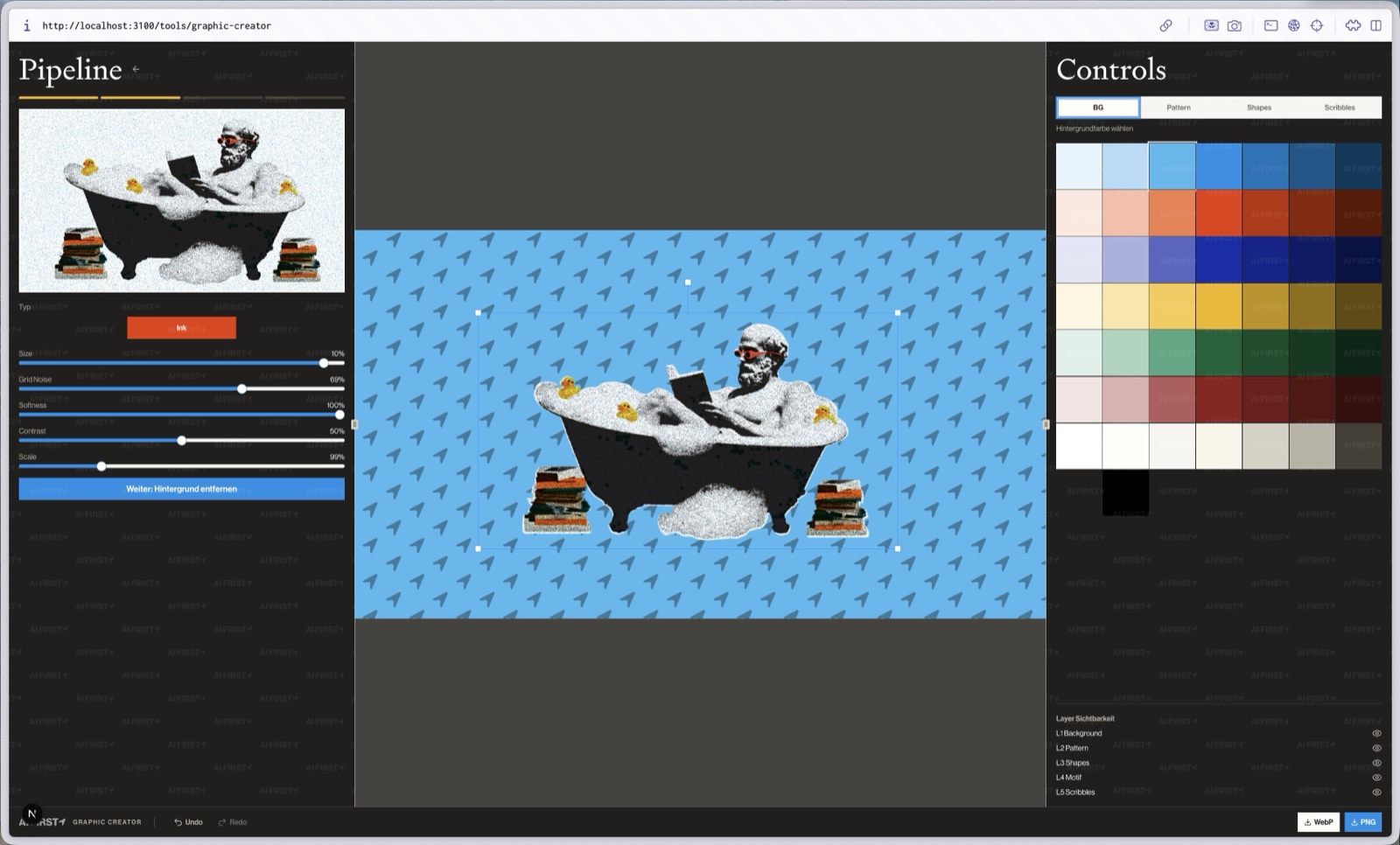 Claude Code hat einen halben Tag eigenständig daran gearbeitet und am Ende stand ein automatisiertes Mini-Canva, das nicht nur perfekte KI-Bilder erstellt, sondern diese auch genau in unser Design-System einbettet und daraus konsistente Grafiken erstellt.