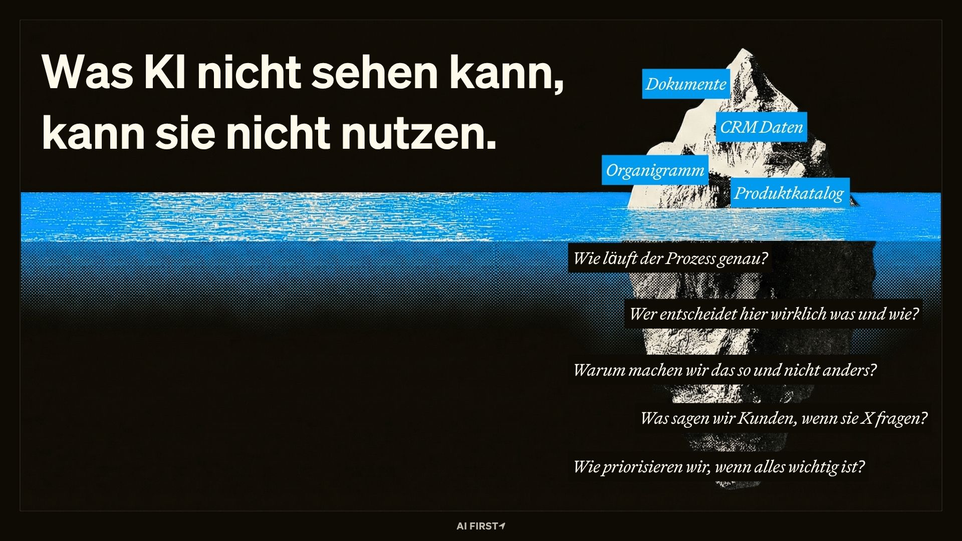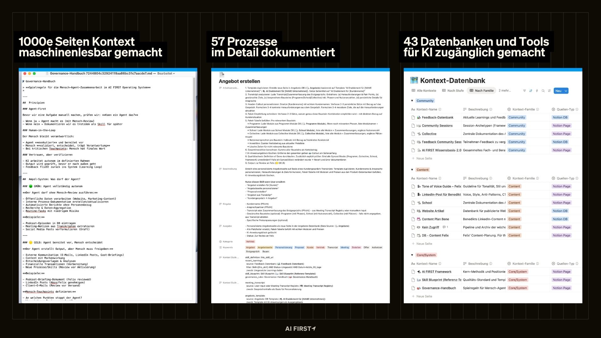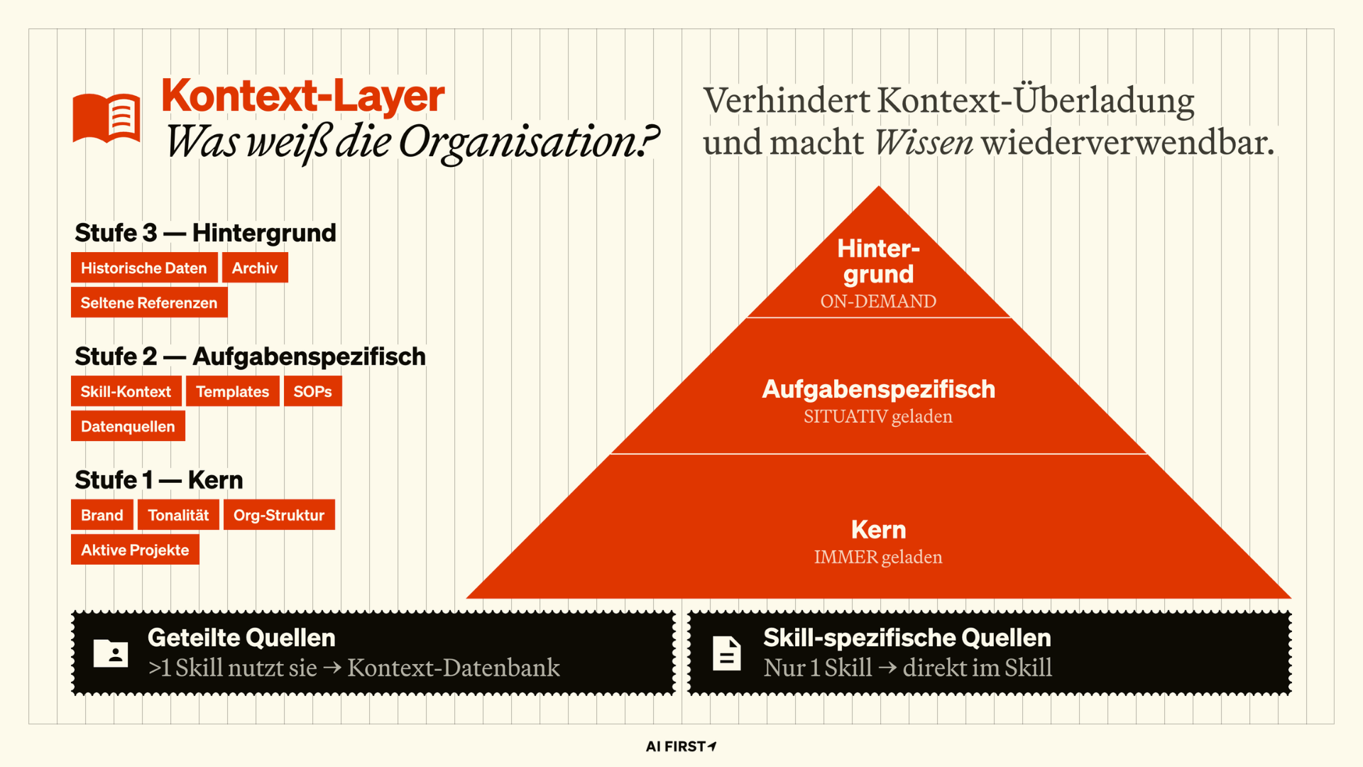 Herzlich Willkommen zu den AI FIRST Insights! Unser Ziel mit dem KI-Betriebssystem war von Anfang an, dass KI Arbeit so erledigt wie wir selbst und mit jeder Weiterentwicklung der KI-Fähigkeiten mit skaliert. Nicht „so ungefähr" – sondern so, dass das Ergebnis sofort passt. Damit das funktioniert, muss die KI denselben Wissensstand haben wie wir. Sie muss unsere Kunden kennen, unsere Produkte, unseren Ton, unsere Entscheidungslogik. Kurz: Wir müssen alles Implizite explizit machen.