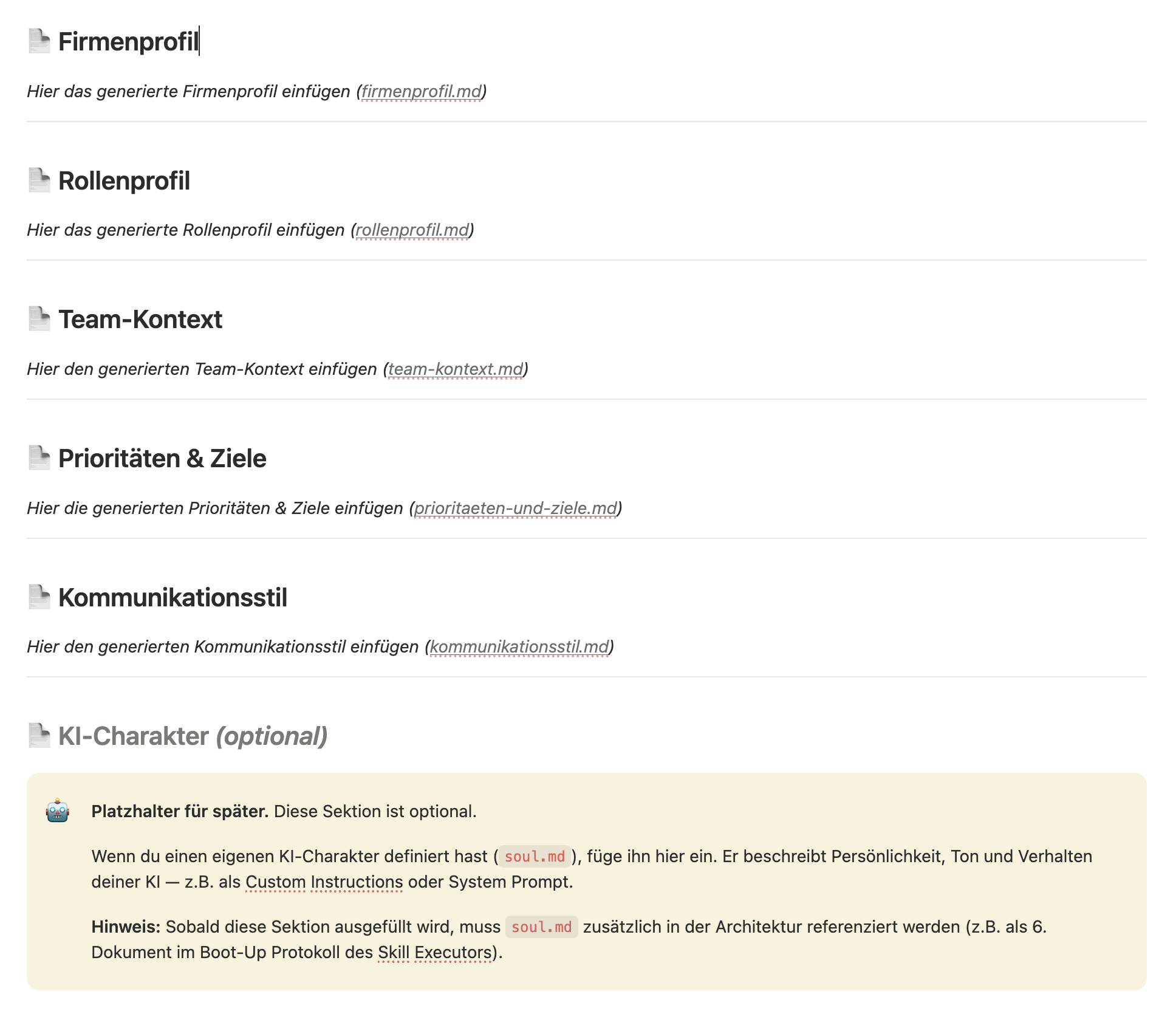 Nicht alle fünf werden immer geladen. Firmenprofil, Rollenprofil und Kommunikationsstil bilden den Kern – die kommen bei jeder Interaktion mit. Team-Kontext und Prioritäten nur dann, wenn die Aufgabe es erfordert. Das ist wichtig, weil jede Information im Kontextfenster Platz und Aufmerksamkeit kostet.